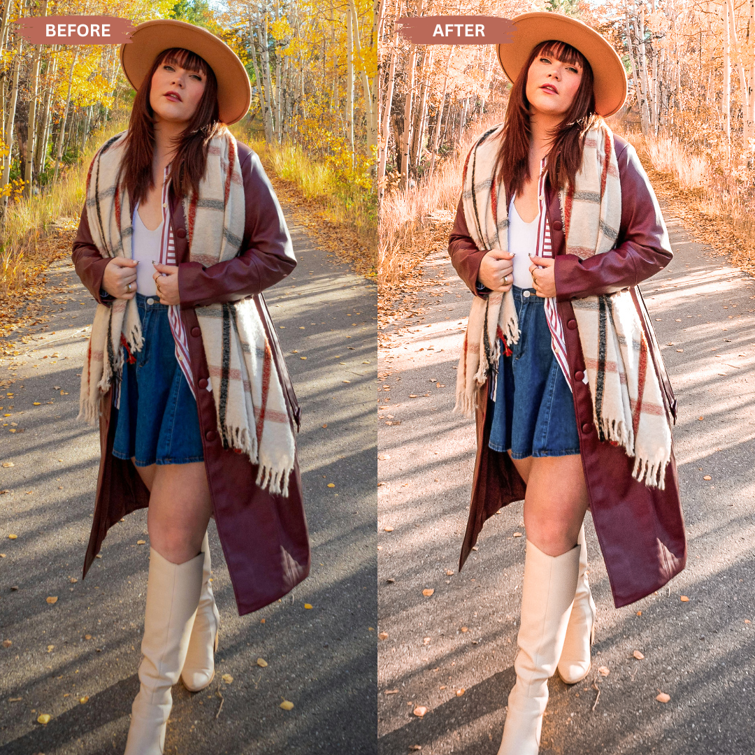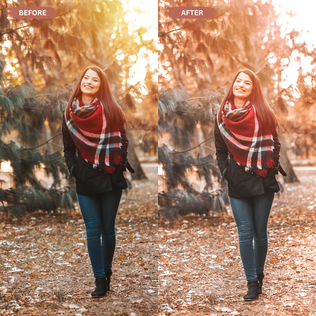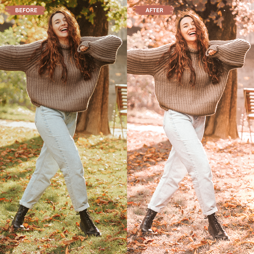 These presets enhance natural light, deepen warm shades, and add a cinematic glow to your photos. Whether you’re shooting seasonal outfits, outdoor walks, or everyday lifestyle moments, your images will instantly feel vibrant, cozy, and social-media ready.