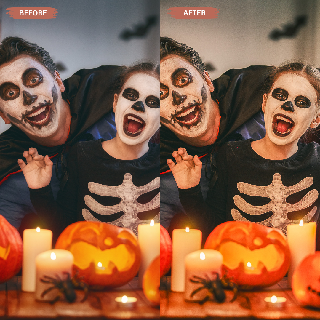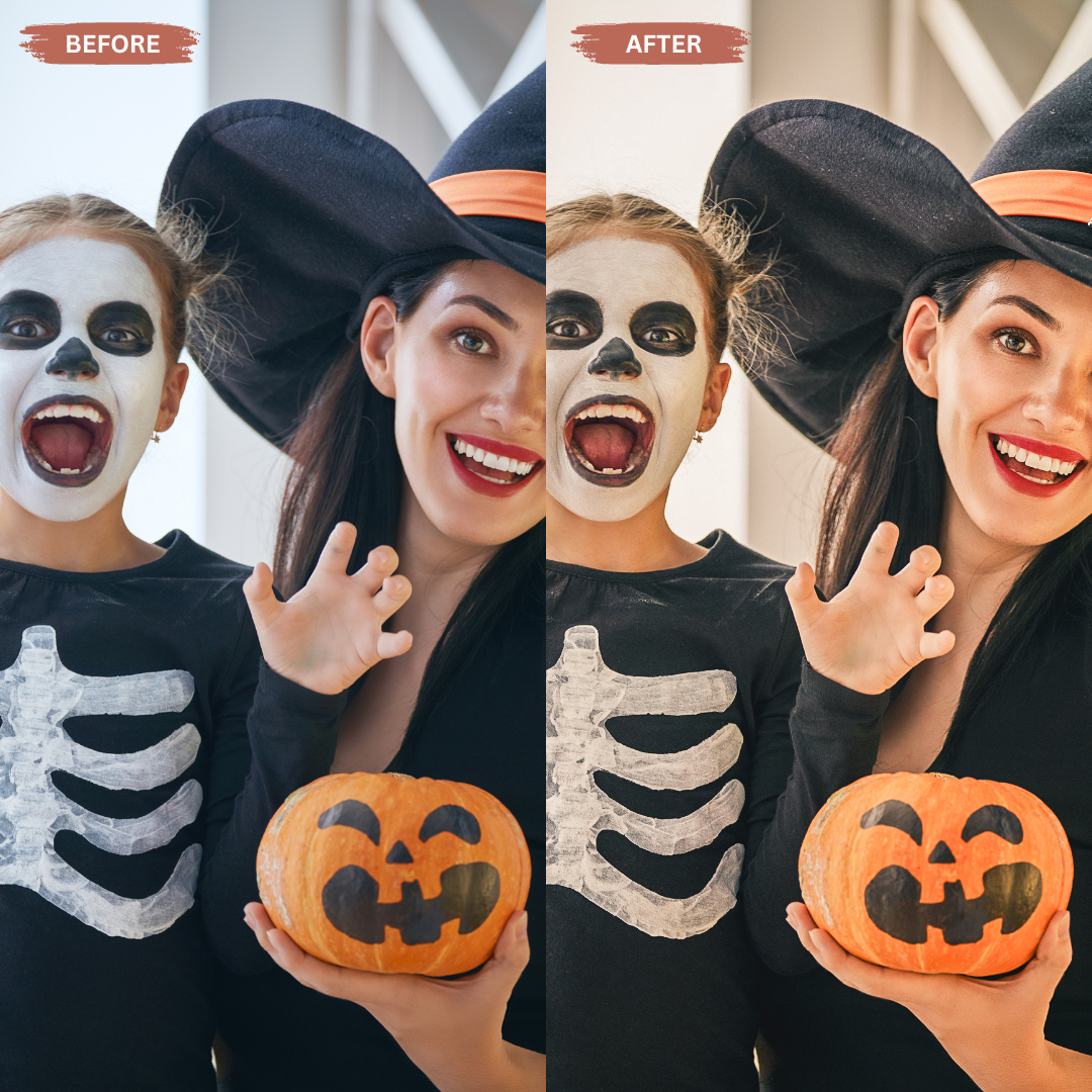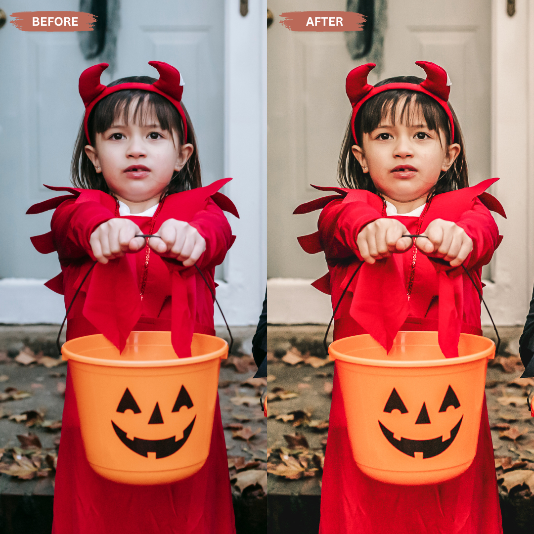 These presets enhance oranges, deepen shadows, and create a cinematic seasonal mood that’s ideal for Halloween celebrations and fall photoshoots. Whether you’re capturing costumes, pumpkin carving, or cozy autumn days, your photos will instantly stand out with a festive fall aesthetic.